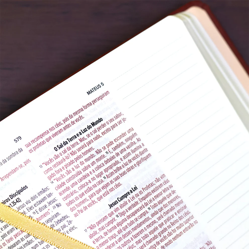 Bíblia NVI - Leia e Anote, luxo traz um design cuidadosamente pensado para permitir que você faça anotações e comentários a partir da leitura das Escrituras. A edição de luxo, na Nova Versão Internacional (NVI), tem um acabamento de alta qualidade que proporciona maior conforto para anotações e melhor visibilidade do texto.
